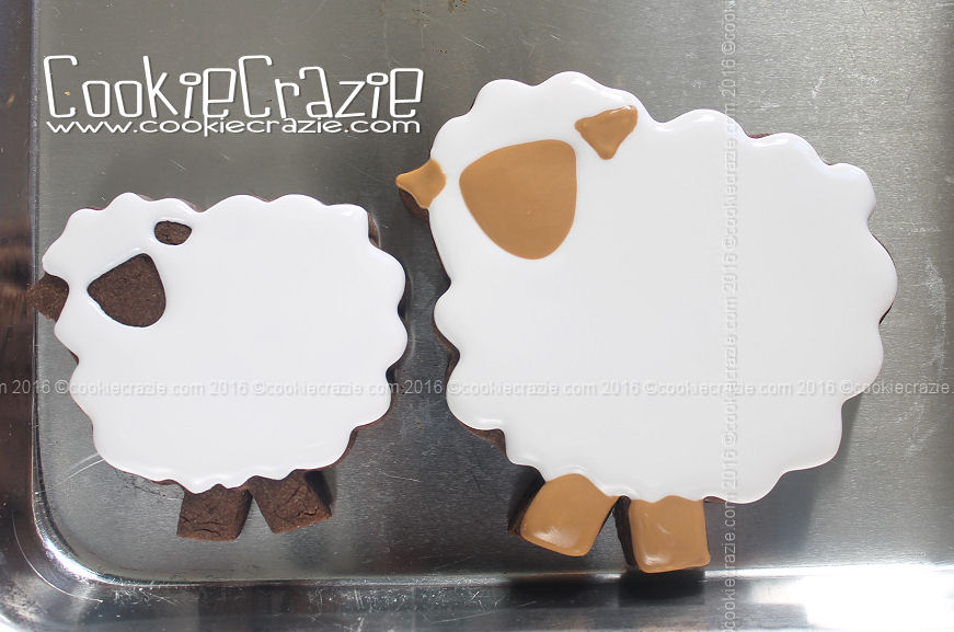 Using this lamb cutter, cover most of the surface with white glaze, but leave the face, ears and hooves bare. Fill those areas in with tan glaze after finishing with the white.