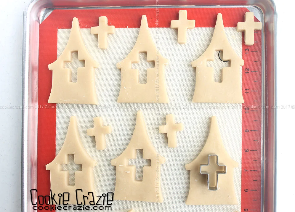 First cut out a mini cross shape out of house or building cookies (cutter found here).