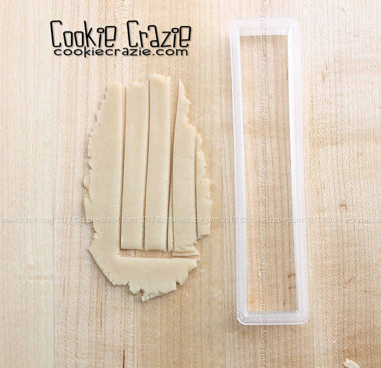 Next, cut out long thin stips of dough (rolled very thin) and lay them on top of the cookie in the spots that correspond with the black keys on the template. (see photo below)